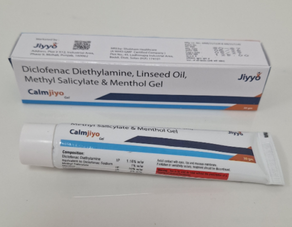 Calmjiyo gel is a combination of four medicines: Diclofenac diethylamine, Linseed Oil, Methyl Salicylate and Menthol. Diclofenac diethylamine and Menthol are non-steroidal anti-inflammatory drugs (NSAIDs) which work by blocking the release of certain chemical messengers that cause pain and inflammation (redness and swelling). Linseed Oil is a plant-based oil which further reduces inflammation and improves blood circulation at the site of application. It also increases the penetration of Diclofenac diethylamine through the skin. Methyl Salicylate produces a cooling effect on the skin.