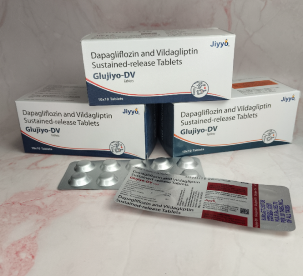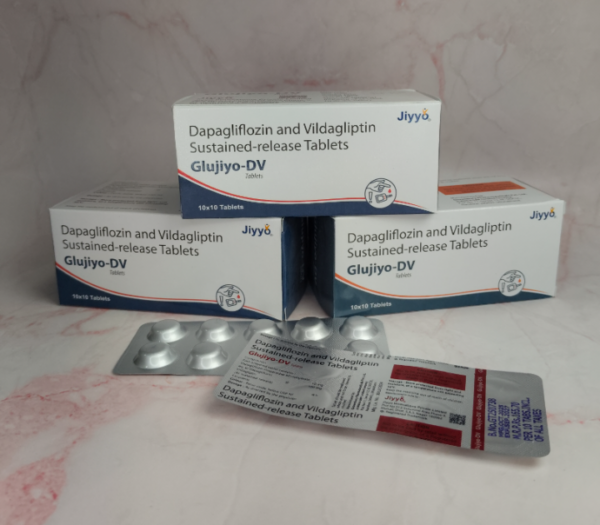 Glujiyo-DV Tablet is a combination of two antidiabetic medications. Dapagliflozin increases urinary glucose excretion and reduces blood glucose levels. Vildagliptin reduces the amount of glucose produced by the liver, by raising insulin levels and decreasing the levels of the glucagon (the hormone that increases blood glucose level).