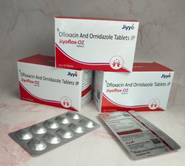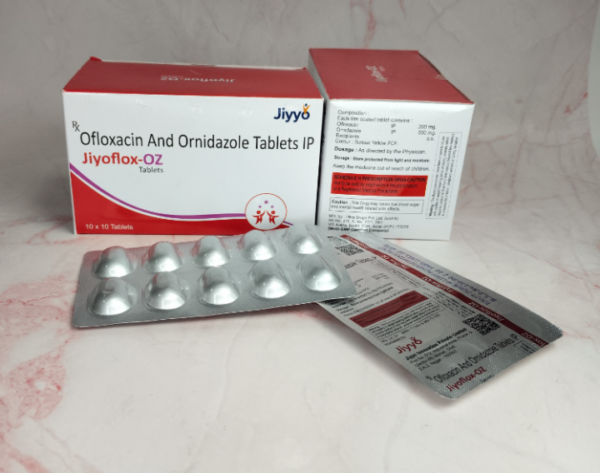 JIYOFLOX-OZ (Ofloxacin + Ornidazole 200 mg/500 mg) Tablet is a combination antibiotic used to treat a variety of bacterial and parasitic infections affecting areas such as the teeth, lungs, gastrointestinal tract, and urinary or genital system. It works by stopping the growth of infection-causing organisms and helping the body recover effectively. The tablet should be taken with food at a fixed time for best results. Do not exceed the prescribed dose, and complete the full course even if you start feeling better, as stopping early may lead to incomplete recovery. Possible side effects include nausea, vomiting, dizziness, or headache, which are usually mild. Maintaining a balanced diet and adequate fluid intake may help reduce discomfort. Consult a doctor if side effects worsen or if signs of an allergic reaction such as rash, itching, swelling, or breathing difficulty occur. Before starting this medicine, inform your doctor about any liver or kidney problems or other medications you are taking. Pregnant or breastfeeding women should seek medical advice before use. Avoid alcohol during treatment, as it may increase dizziness. While it usually does not affect driving, avoid driving if you feel drowsy or dizzy. Adequate rest during treatment supports better recovery. At Jiyyo, we bridge the gap between quality and affordability. JIYOFLOX-OZ is manufactured in state-of-the-art facilities following strict global safety standards. Because of our commitment to excellence, Jiyyo's own network of doctors frequently prescribes this medicine, ensuring patients receive reliable treatment they can trust.Uses