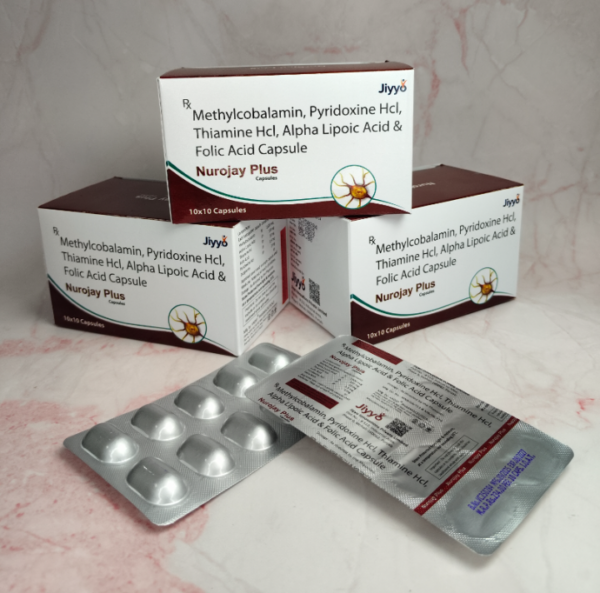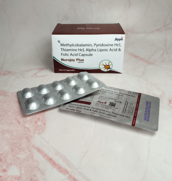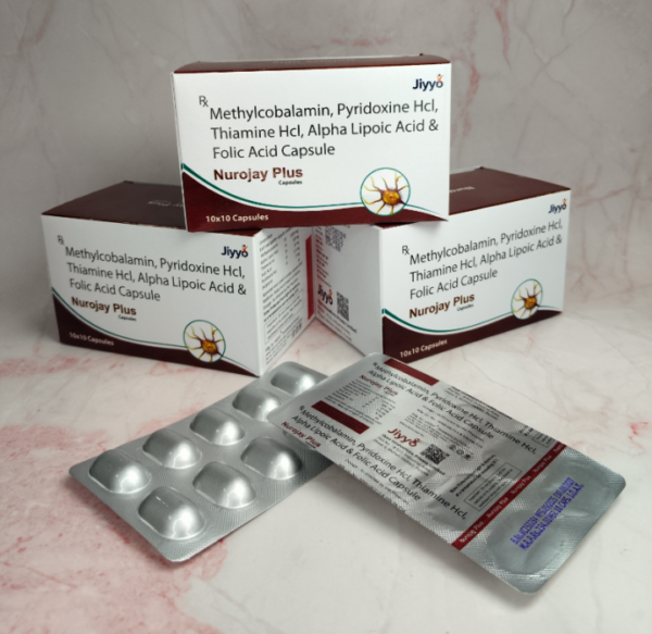 Nurojay-Plus is a combination of five nutritional supplements. Methylcobalamin is an active form of Vitamin B 12. This helps in proper cell growth and development, helps in protein synthesis and production of blood cells (red and white blood cells). Alpha Lipoic Acid is an antioxidant that repairs cell damage and restores vitamin level in the body, it also improves the functions of the nerves. Vitamin B6 (Pyridoxine) is a vitamin nutritional supplements that regulate essential metabolic functions in the body for proper growth and development. Folic Acid is also known as folate or vitamin B9. It helps in producing blood (hemoglobin) in the body. This is how it works in the treatment of nutritional deficiencies.
